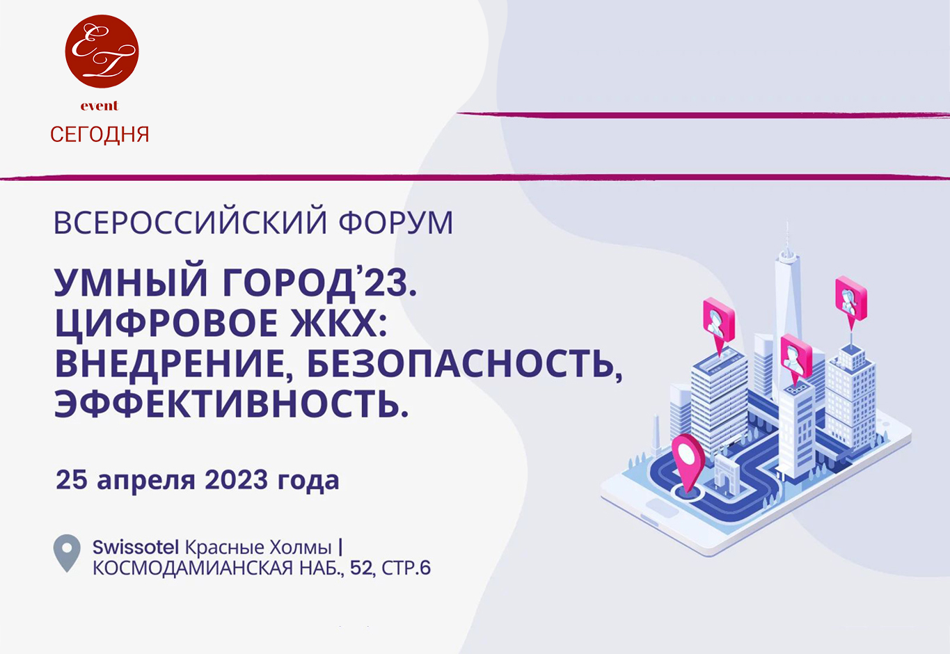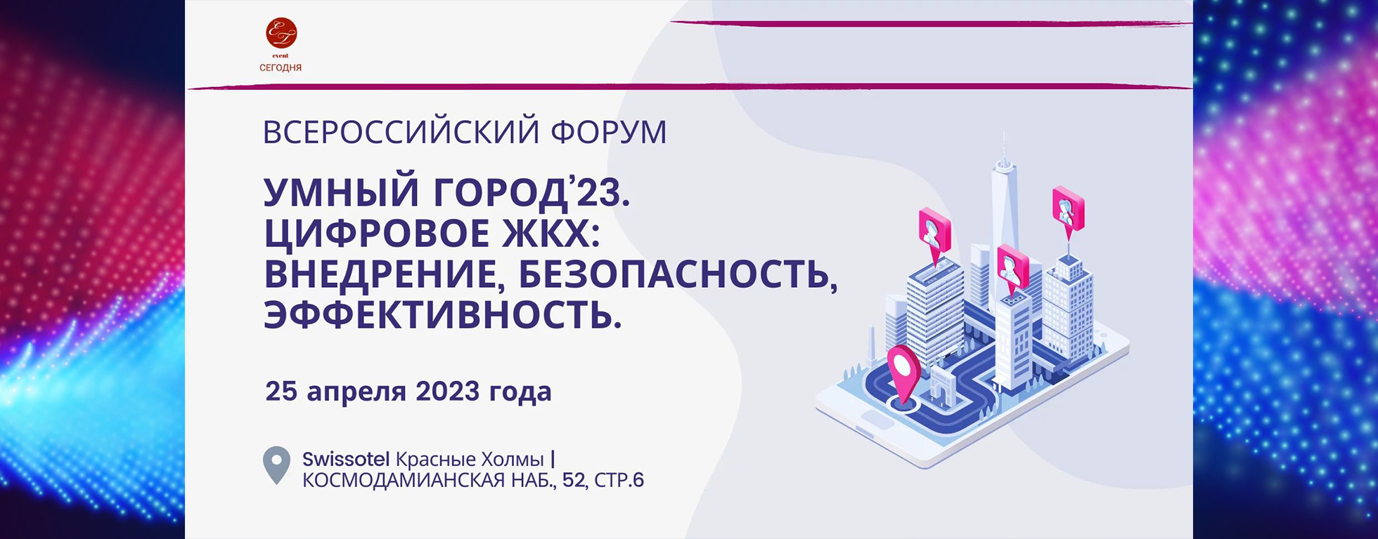 Всероссийский форум «Умный город’23. Цифровое ЖКХ: внедрение, безопасность, эффективность» 25 апреля 2023 года | Swissotel Красные Холмы | КОСМОДАМИАНСКАЯ НАБ., 52, стр. 6 (Москва)