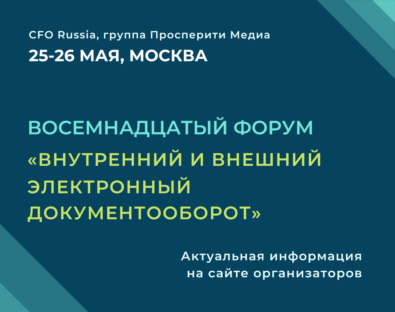 25-26 мая в Москве пройдет Восемнадцатый форум «Внутренний и внешний электронный документооборот» организованный группой «Просперити Медиа» и порталом CFO-Russia.ru.Ключевые темы форума: