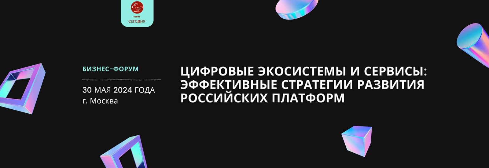 30 мая 2024 года на площадке центра конференций “Сегодня”, в рамках бизнес-форума эксперты и лидеры по цифровой трансформации - представители регулятора и бизнеса определяет потенциал и точки роста развития цифровых платформ в России, а также представят практики использования нововведений в бесшовной среде для снижения транзакционных издержек и построения алгоритмизированных взаимовыгодных отношений контрагентов - субъектов экономики. Мероприятие станет отличной площадкой для общения и формирования сообщества с единомышленниками и коллегами для совместного построения стратегии поведения бизнеса в цифровую эпоху.
