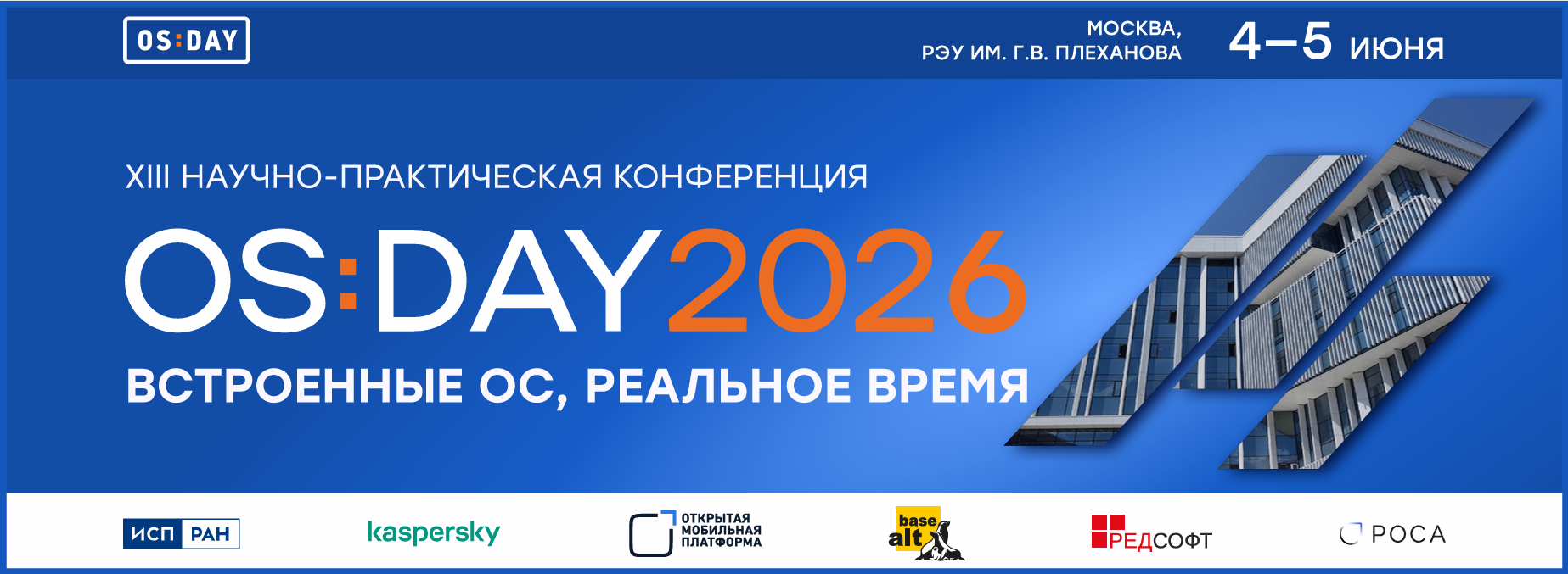 Ежегодная XIII научно-практическая конференция «OS DAY. Встроенные ОС, реальное время» пройдет 4-5 июня на базе РЭУ им. Г.В. Плеханова. Центральными на OS DAY 2026 станут вопросы, касающиеся операционных систем для встроенных устройств и ОС реального времени. Необходимость создания собственных локализованных автоматических систем управления технологическими процессами и сопутствующей им инфраструктуры становится сегодня вопросом национальной безопасности, что делает темы этого года особенно актуальными.Участие в конференции примут специалисты в области системного программирования, представители отраслевых регуляторов, руководители высших учебных заведений, профильных факультетов и кафедр. Приглашены к диалогу и представители компаний-производителей аппаратных систем: успешное решение задачи безопасности АСУТП может быть только комплексным, с учетом как операционных систем и средств их разработки, так и «железа». Только так можно добиться максимальной надежности встроенных систем.